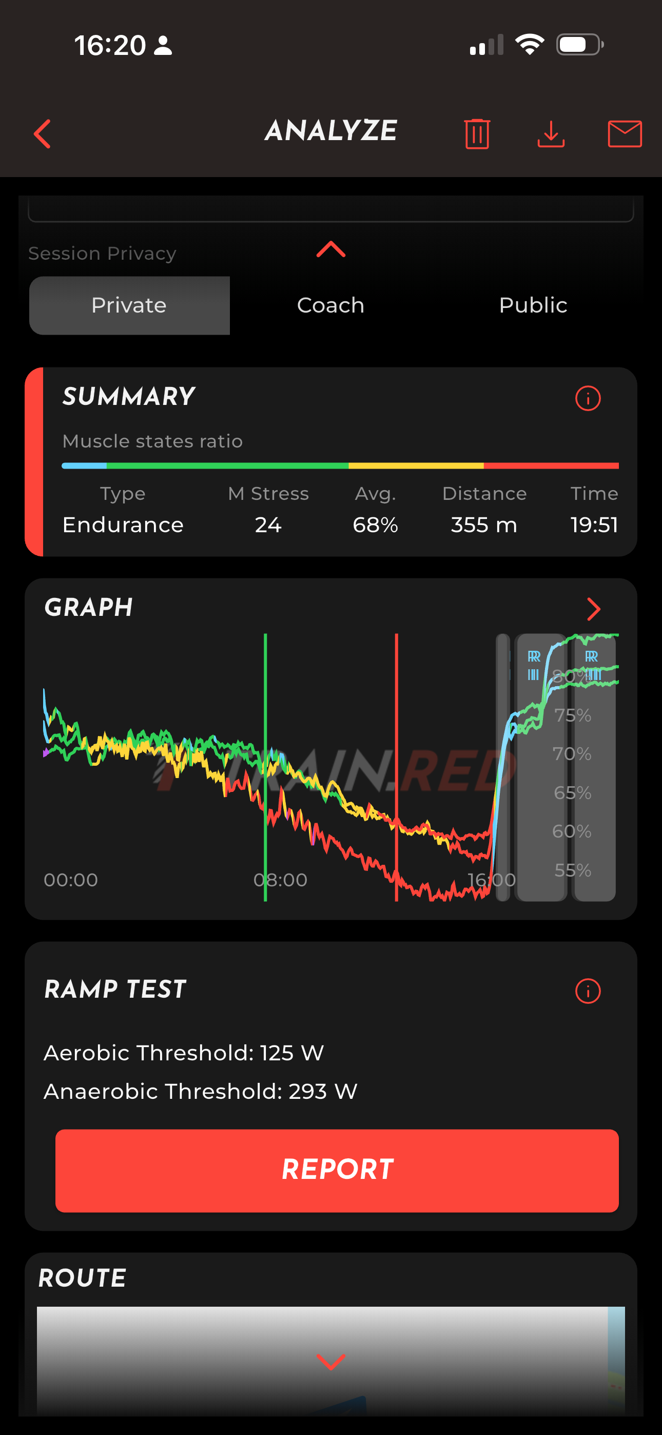 Progressive intensity test with muscle oxygen monitoring. Triple linear regression analysis identifies your aerobic threshold (fat burning transition) and anaerobic threshold (lactate accumulation point).